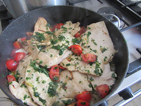 להחזיר עוף, להוסיף את  הרוטב והעגבניות, לבשל מכוסה עוד 5-7 דקות